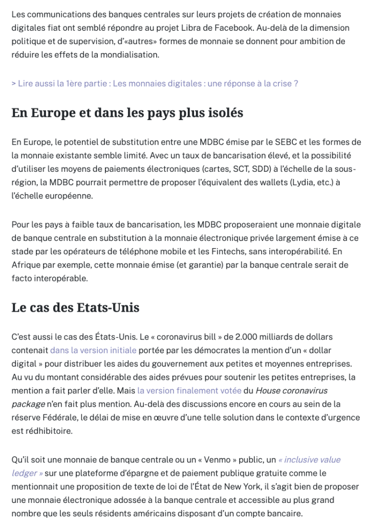 Les monnaies digitales à l’heure de la crise EB Economie internationale, Monnaie, Paiements 3 avril 2020 1 Minute Deux articles écrits pour Finance Mag en mars et avril 2020, visibles en ligne ICI et LA. Partager : Cliquez pour partager sur Facebook(ouvre dans une nouvelle fenêtre) Facebook Cliquer pour partager sur X(ouvre dans une nouvelle fenêtre) X J’aime chargement… Articles similaires Publié par EB Voir tous les articles par EB Publié 3 avril 2020